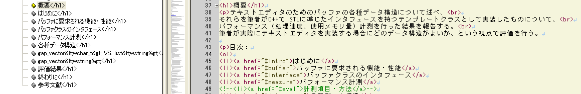 | 詳細: | ■ 現在の状態: ----- 概要</h1> はじめに</h1> バッファに要求される機能・性能</h1> バッファクラスのインタフェース</h1> パフォーマンス計測</h1> 各種データ構造</h1> gap_vector<wchar_t> VS. list<wstring></h1> gap_vector<wstring></h1> 評価結果</h1> 終わりに</h1> 参考文献</h1> ----- ■ 期待する状態: ----- 概要 はじめに バッファに要求される機能・性能 バッファクラスのインタフェース パフォーマンス計測 各種データ構造 gap_vector<wchar_t> VS. list<wstring> gap_vector<wstring> 評価結果 終わりに 参考文献 ----- | ||||||||