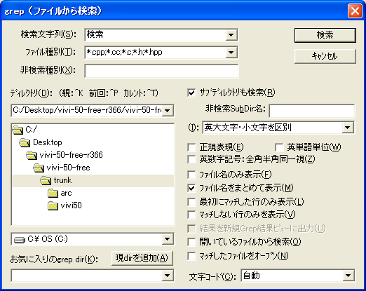 | 詳細: | ■ 操作前状態: ----- 適当なファイルをviviでopenした状態。 ----- ■ 具体的操作: 1. shift + F4でgrepのウィンドウを表示する 2. 「検索文字列」に何か文字列を入力する 3. [検索]ボタンを押下する ■ 操作後状態: ----- ・アウトプットビューに検索中のメッセージは出力されるが、その後の進捗が表示されない。 ・viviのプロセスがCPUの1コアを100%使い続ける状態になる。 ----- ■ 期待する状態: ----- ・グローバル検索が行われて、条件にマッチする箇所をアウトプットビューに表示して欲しい。 ----- ■ 補足・再現条件: vivi 5.0のソースコードを引っ張ってきて"検索"って文字列でgrepしました。 http://sourceforge.jp/projects/vivi-50-free/scm/svn/tree/head/trunk/ Rev.366です。 grepの設定は添付画像の通り(デフォルト設定から変更していないはず...)です。 「サブディレクトリの検索」はチェックありで実施しました。 | ||||||||
