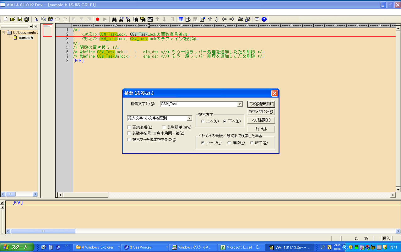 | メモ: 「OSM_TaskLock、OSM_TaskLock」に対しては再現しないが、 「OSM_TaskLock、OSM_TaskLockの関数宣言追加」に対しては再現する。 「OSM_TaskLock」を検索した場合は再現しない 正規表現ONの場合も再現しない |