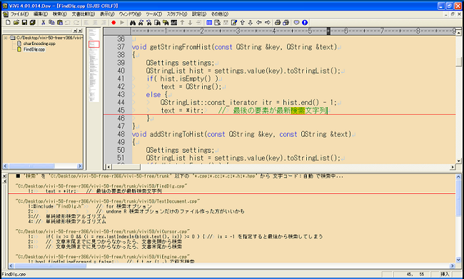 | また、画像サンプルに vivi5.0を使用させて頂きました m(_ _)m "検索"の文字列でgrepしたところ、編集ビューでは45行目がマッチしているのですがアウトプットバーでは「1行目」になってしまいました。 「正規表現:ON」であれば再現しないので、とりあえず常時正規表現ONで利用し続けてみます。 |